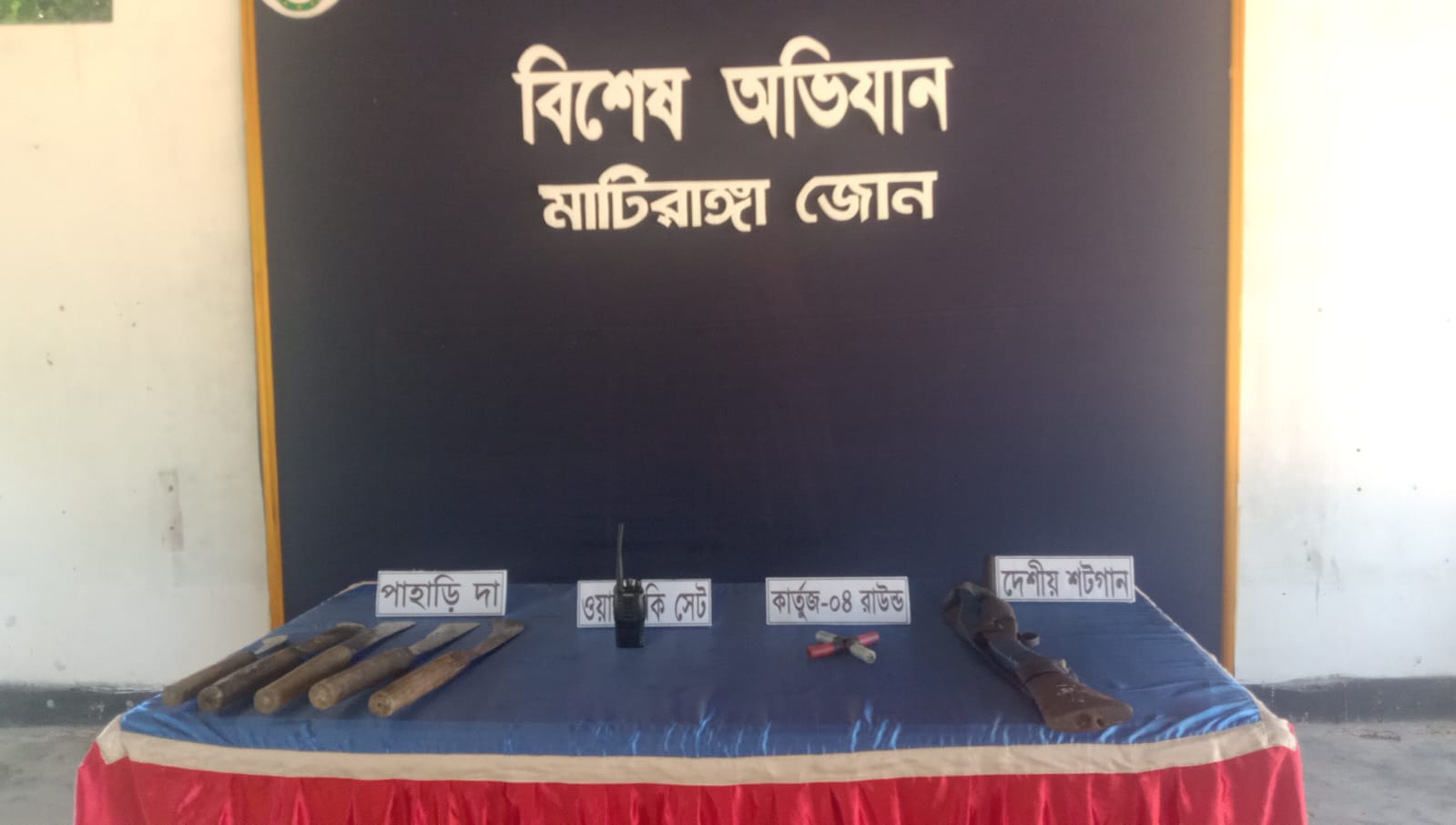 খাগড়াছড়ির মাটিরাঙ্গায় বিশেষ অভিযান চালিয়ে দেশীয় তৈরি অস্ত্র ও গোলাবারুদ উদ্ধার করেছে মাটিরাঙ্গা সেনা জোন।