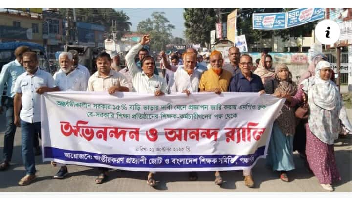 অন্তর্বতিকালীন সরকার ১৫% বাড়ি ভাড়ার দাবি মেনে নিয়ে প্রজ্ঞাপন জারি করায় পঞ্চগড়ে অভিনন্দন ও আনন্দ মিছিল করেছে এমপিওভ‚ক্ত শিক্ষক-কর্মচারীরা। গতকাল মঙ্গলবার বিকেলে জাতীয়করণ প্রত্যাশী জোট ও বাংলাদেশ শিক্ষক সমিতির ব্যানারে ওই মিছিল অনুষ্ঠিত হয়। জেলা শহরের চৌরঙ্গী মোড় থেকে মিছিলটি শুরু হয়ে পঞ্চগড়-বাংলাবান্ধা মহাসড়ক ধরে আনন্দ মিছিলটি আবারও চৌরঙ্গী মোড়ে এসে শেষ হয়। সেখানে সংক্ষিপ্ত সমাবেশে বক্তব্য দেন জাতীয়করণ প্রত্যাশী মহাজোটের পঞ্চগড় জেলা সমন্বয়ক ও কমলাপুর উচ্চ বিদ্যালয়ের প্রধান শিক্ষক জাহাঙ্গীর আলম, জিয়া পরিষদ পঞ্চগড় জেলা শাখার সাধারণ সম্পাদক কায়েদ-ই-আজম, পঞ্চগড় সদর উপজেলা শিক্ষক সমিতির সদস্য সচিব ও পঞ্চগড় উচ্চ বিদ্যালয়ের ভারপ্রাপ্ত প্রধান শিক্ষক মিজানুর রহমান, ঘাগড়া দ্বারিকামারী উচ্চ বিদ্যালয়ের ভারপ্রাপ্ত প্রধান শিক্ষক সোহরাব হোসেন, উত্তর দর্জিপাড়া উচ্চ বিদ্যালয়ের সহাকারী শিক্ষক রবিউল ইসলাম প্রমূখ।