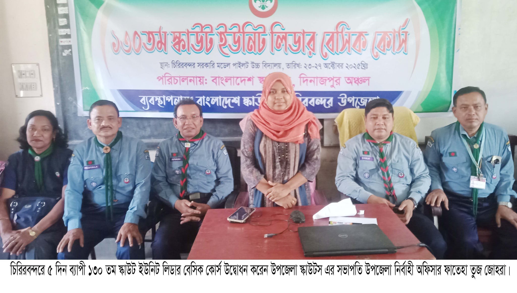 বৃহস্পতিবার (২৩ অক্টোবর) দুপুর ১২ ঘটিকায় চিরিরবন্দর সরকারি মডেল পাইলট উচ্চ বিদ্যালয়ে উপজেলা স্কাউটস এর আয়োজনে বাংলাদেশ স্কাউটস দিনাজপুর অঞ্চলের পরিচালনায় ৫ দিন ব্যাপী ১৩০তম স্কাউট ইউনিট লিডার বেসিক কোর্স উদ্বোধন করেন উপজেলা স্কাউটস এর সভাপতি উপজেলা নির্বাহী কর্মকর্তা ফাতেহা তুজ জোহরা।